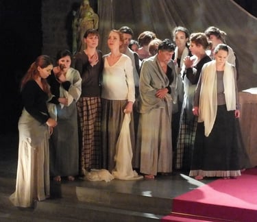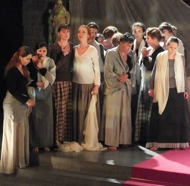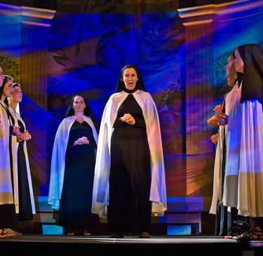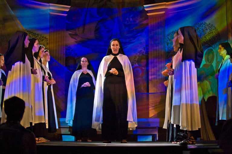 AT : Tout à fait. Et d'ailleurs, chaque fois que j'ai monté ce spectacle, j'ai emmené les jeunes femmes qui jouaient les rôles des carmélites dans un des Carmels, et aussi les solistes masculins ainsi que mes assistants et Odile la pianiste. Au Carmel de Chambéry, nous avons rencontré soeur Bernadette, qui nous a accueillis magnifiquement, qui a elle-même eu une autre vie avant son entrée au Carmel, ce qui a ajouté à la force de cette rencontre. Nous sommes aussi allés au Carmel du Reposoir, au dessus d'Annecy. Chaque fois c'est une rencontre qui bouleverse les jeunes femmes qui jouent le spectacle. Ces jeunes femmes sont d'ailleurs très conscientes du sens de ce qu'elles font.