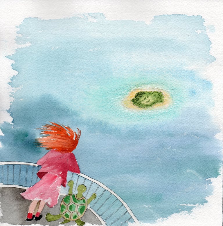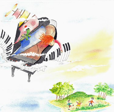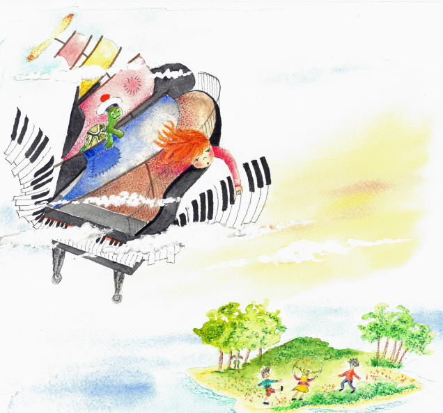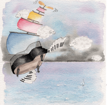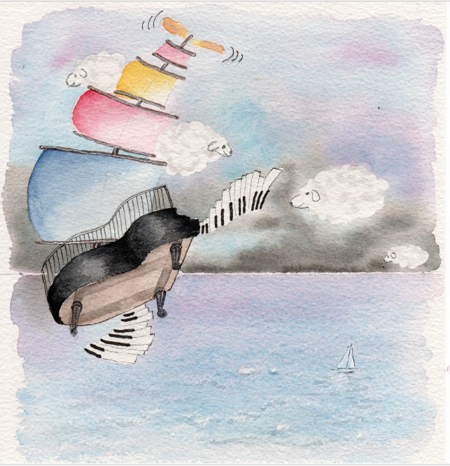 Un jour elle s’endort. La jupe de maman devient une voile et le piano prend son envol.